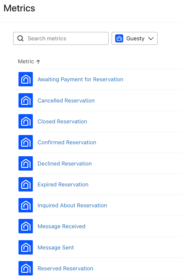 - Navigate to Analytics > Metrics. Here, you can view all of the metrics in your account. The metrics with a Guesty icon represent all of the metrics synced from your Guesty integration.