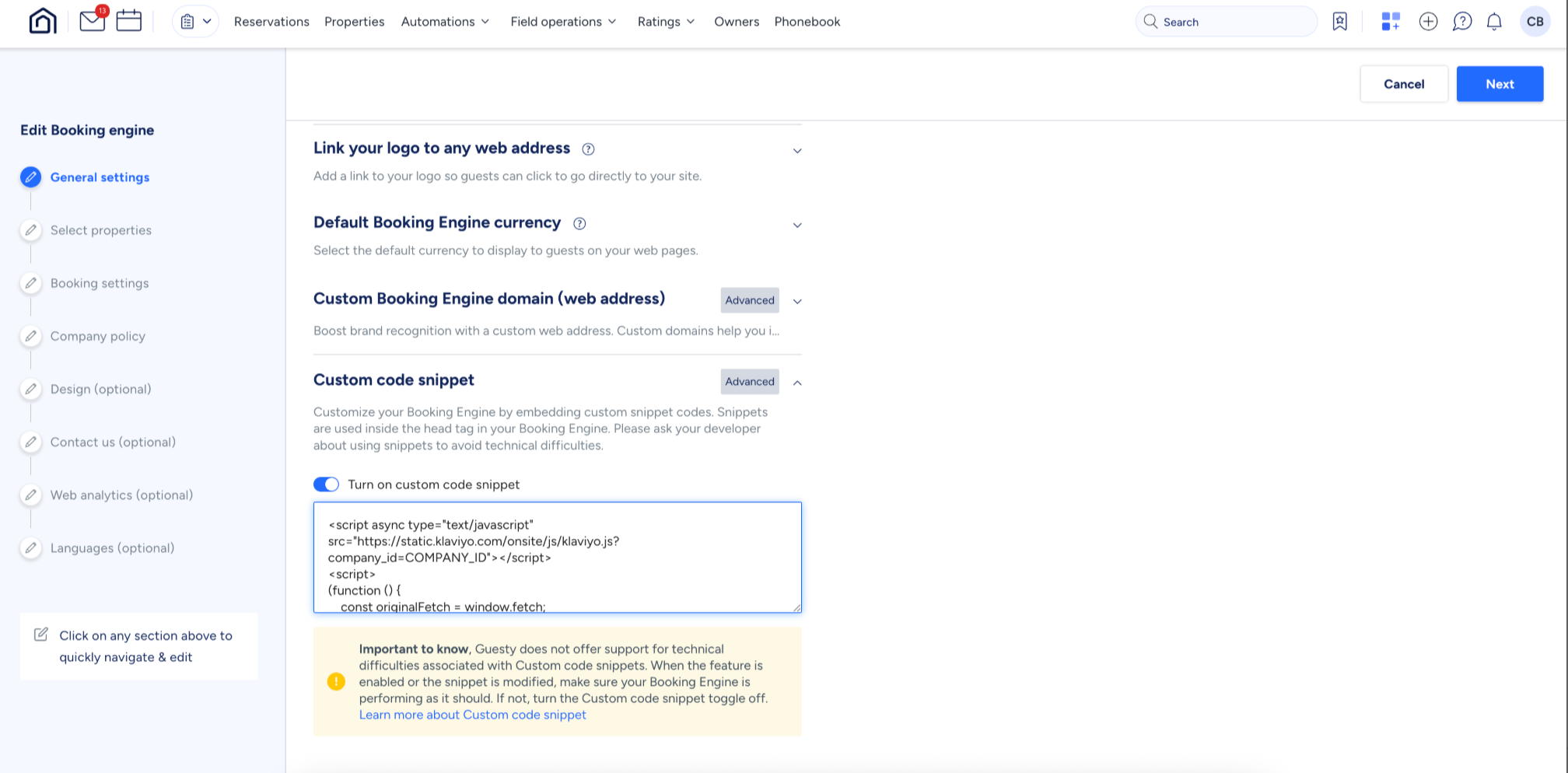 - Copy the GuestyEvents code from Github and paste it into the custom code snippet box.