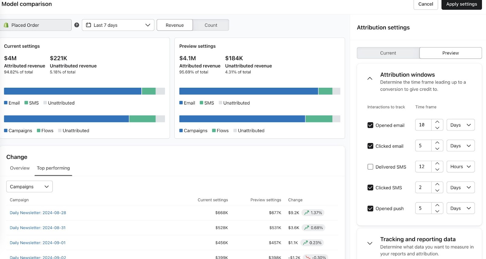 Klaviyo’s new attribution model will recalculate historical data after attribution settings in account are updated, so past and future data remains consistent. Additionally, the new model will update attribution within 3 hours, instead of instantly.
