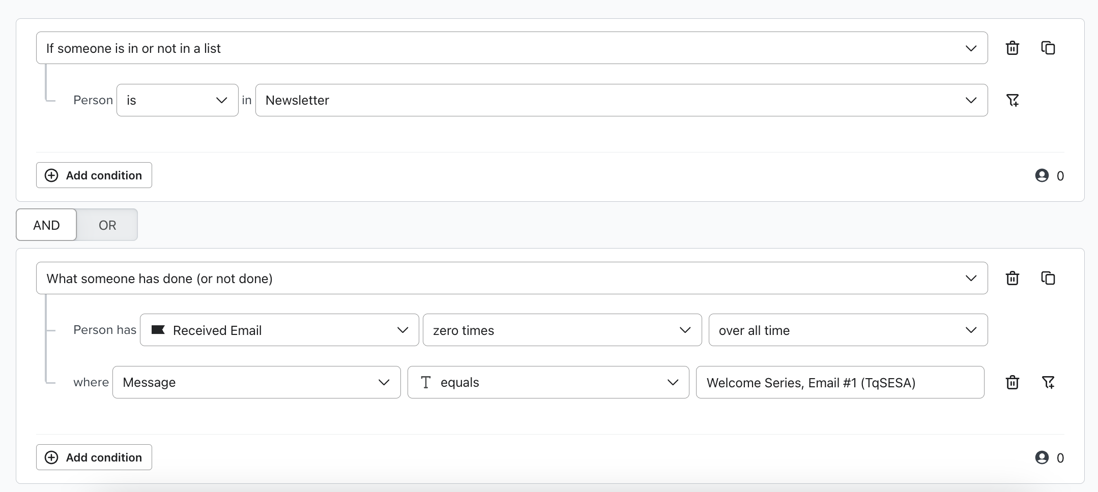 - Build a segment with conditions that exactly match the trigger and event filters of the flow. For example, if your flow is triggered by the list Newsletter and has no flow filters, use the segment definition If someone is in or not in a list > is in > Newsletter.
