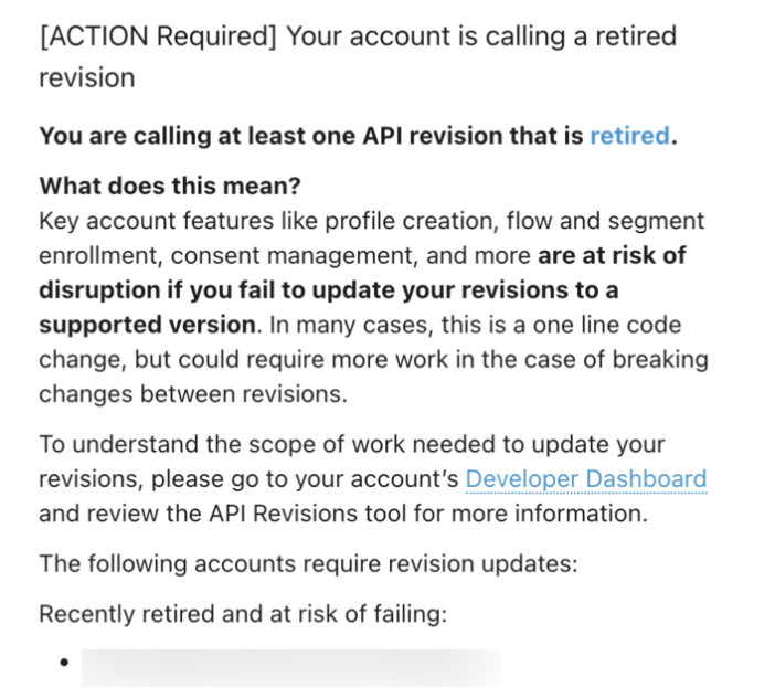 Are you seeing a notification in Klaviyo that reads “[ACTION Required] Your account is calling a retired revision”, like the one below?