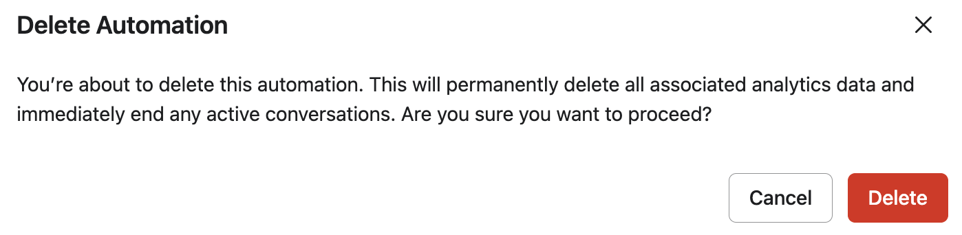 Please note that you cannot recover an automation once it’s deleted. When you delete, it also removes all data, messages, etc. for that automation. Additionally, if the automation is turned on, deleting the automation ends any conversations for anyone in it.